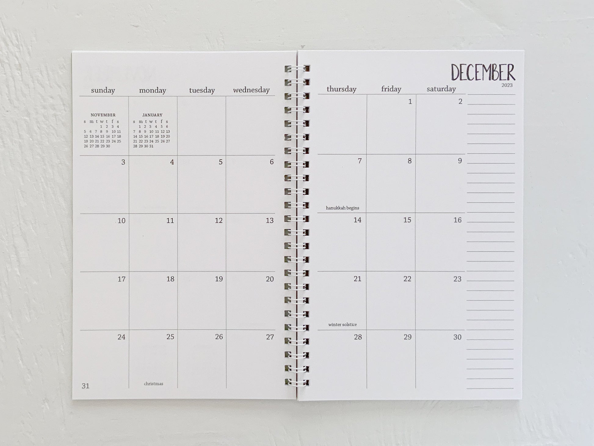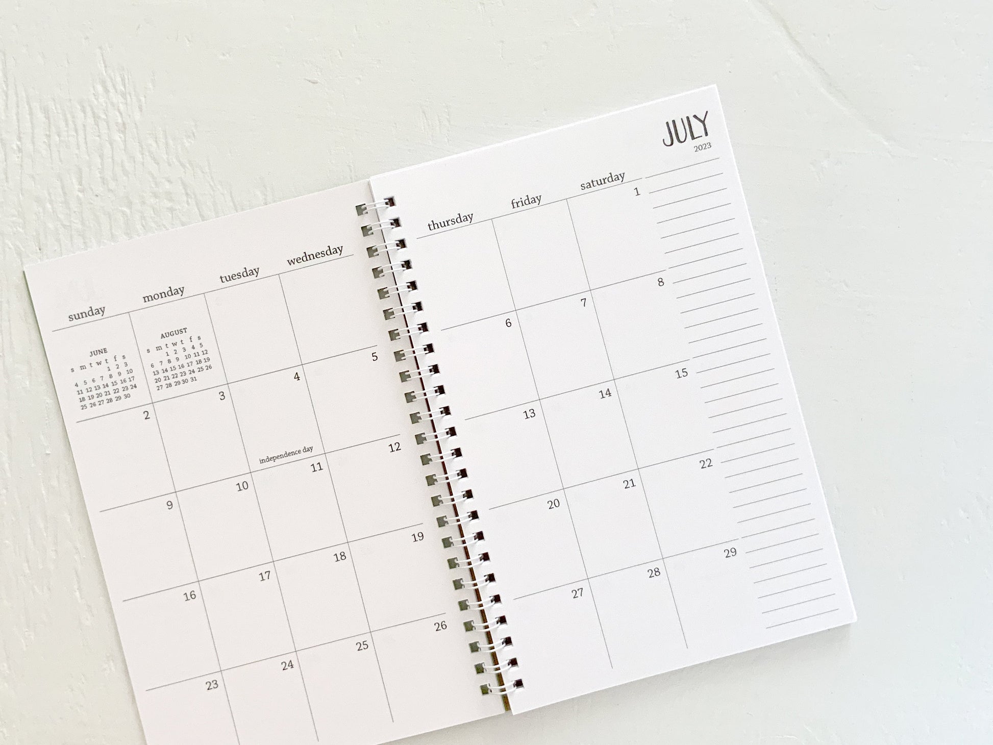 planner is spiral bound and three blank lines are hot hand foil stamped on the cover.