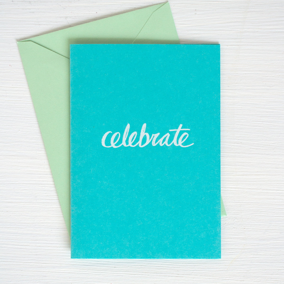 folded note cards with handwritten CELEBRATE hand hot foil stamped in white or gold. this type of printing leaves a slight impression where the die meets the paper.