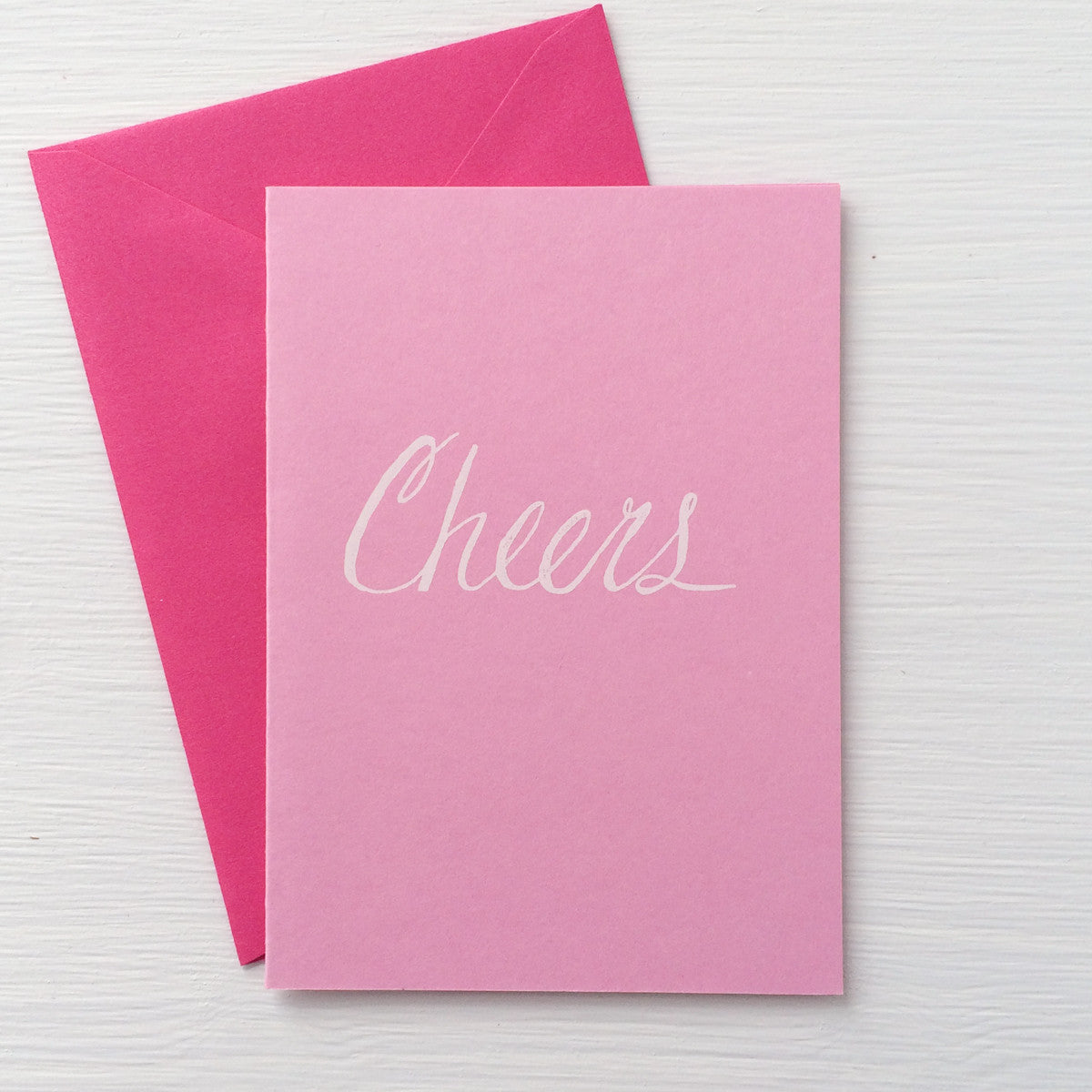 folded note cards with handwritten "cheers" hand hot foil stamped in white or gold. this type of printing leaves a slight impression where the die meets the paper.
