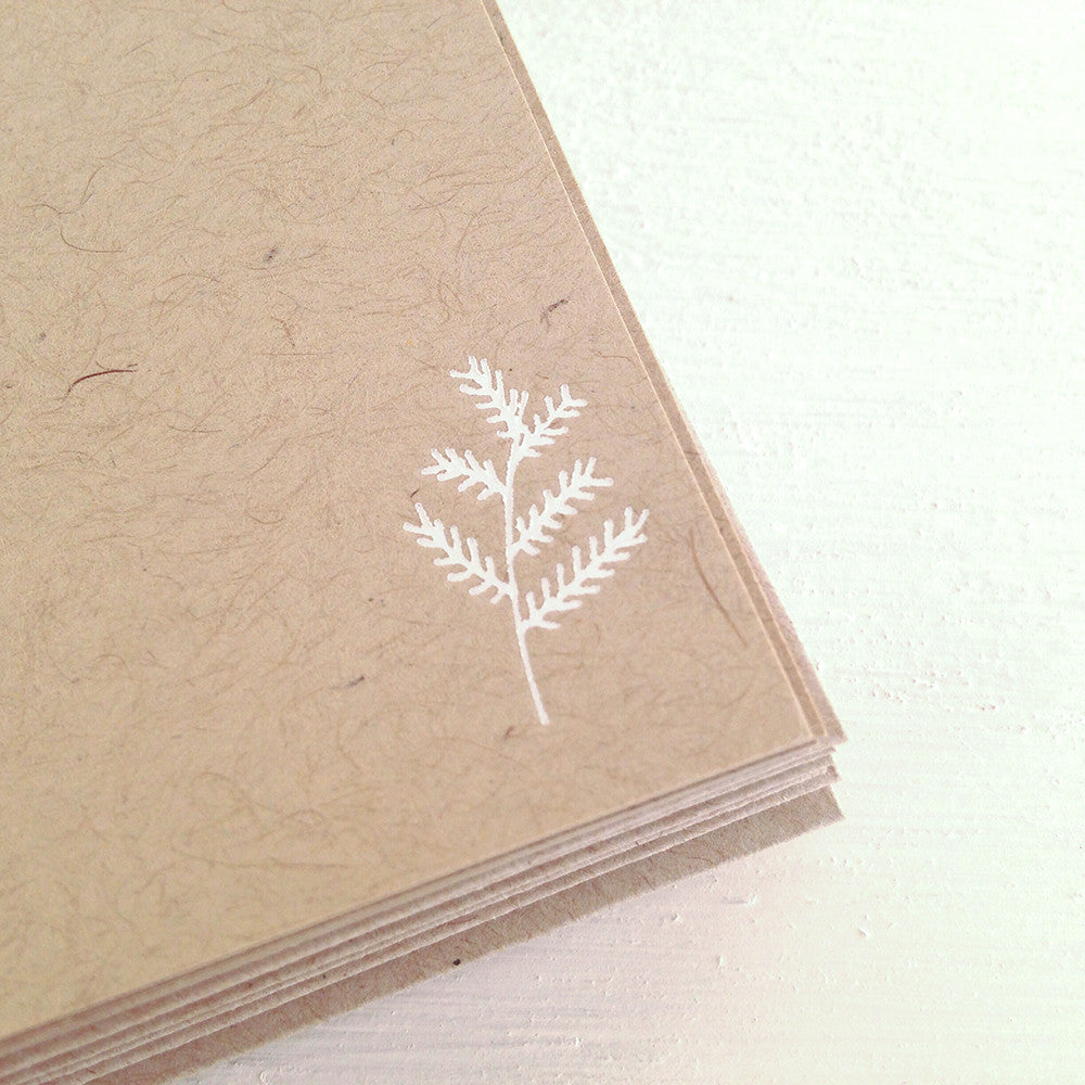 lovely set of flat kraft notecards with a white evergreen leaf hot foil stamped in the bottom corner. these cards are great to use for thank yous, invitations or a note to a loved one. keep an extra set on hand for sweet & simple gifts - they are the perfect size for stocking stuffers.