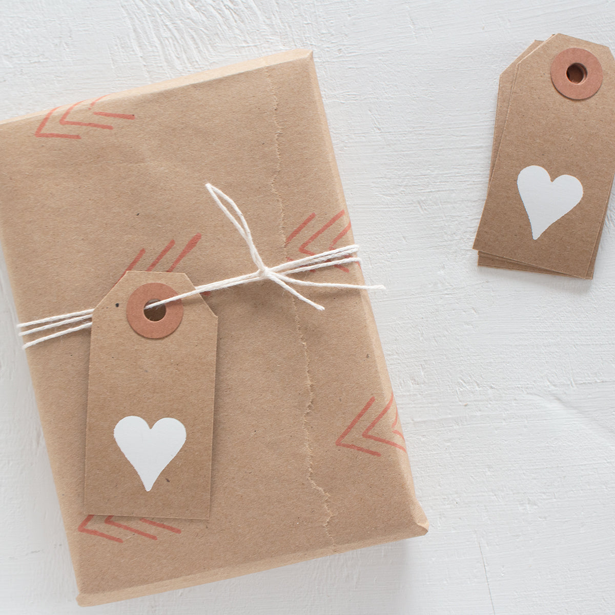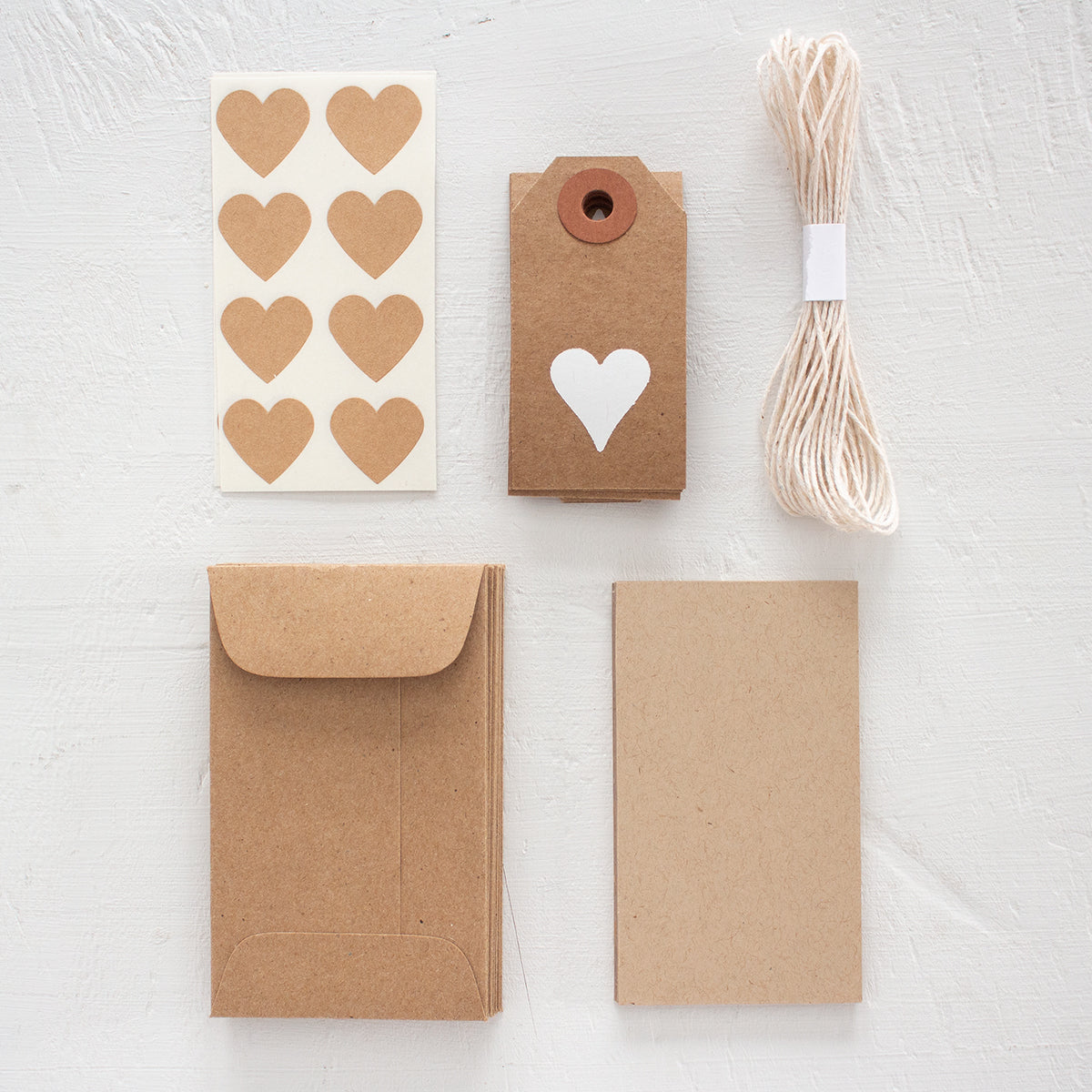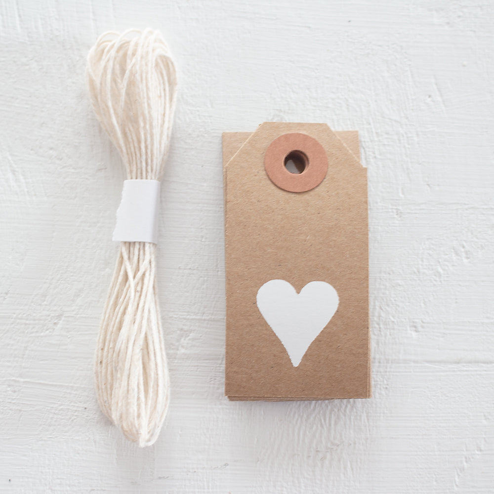 • 10 mini kraft gift tags (2¾" x 1-3/8") with a white hand foil stamped heart