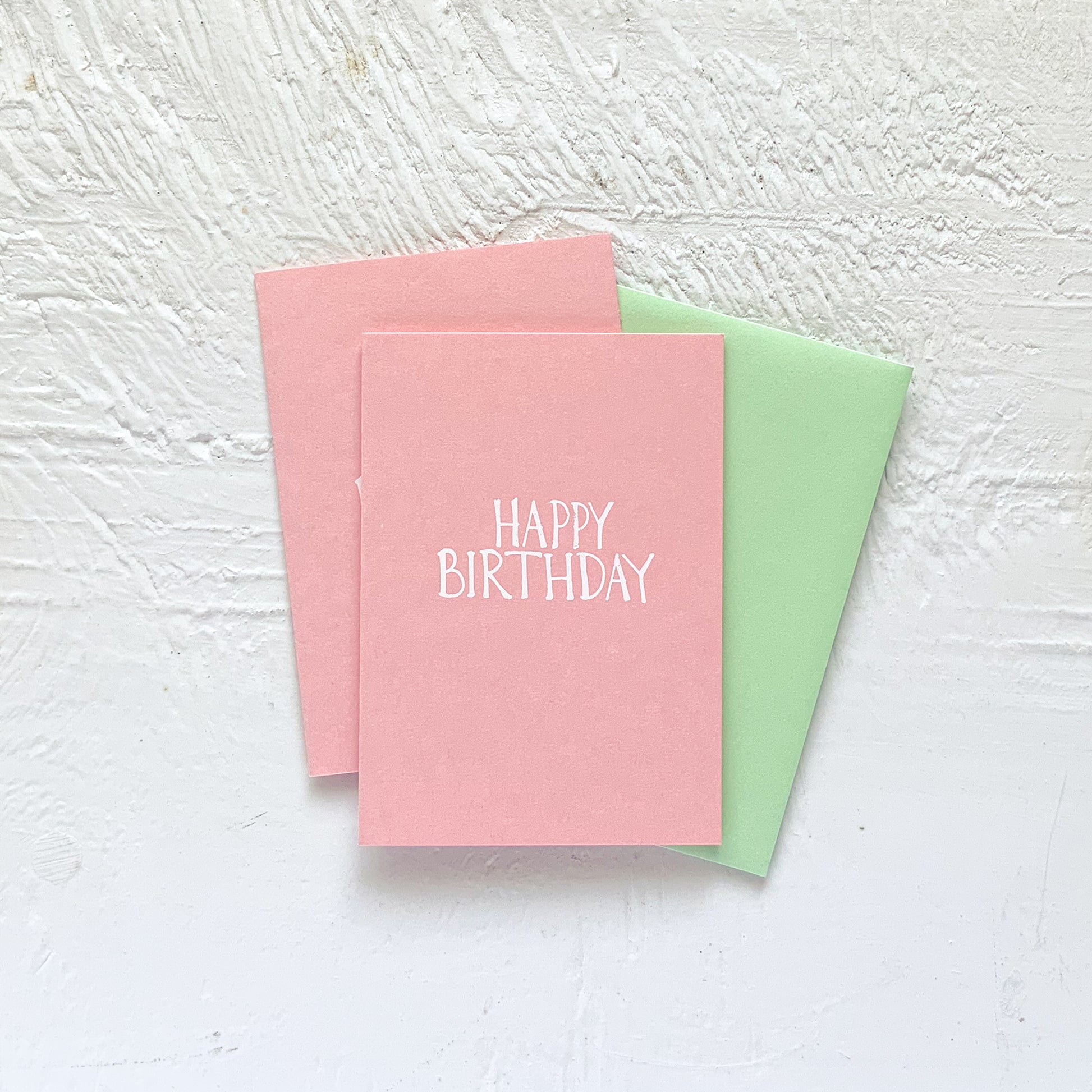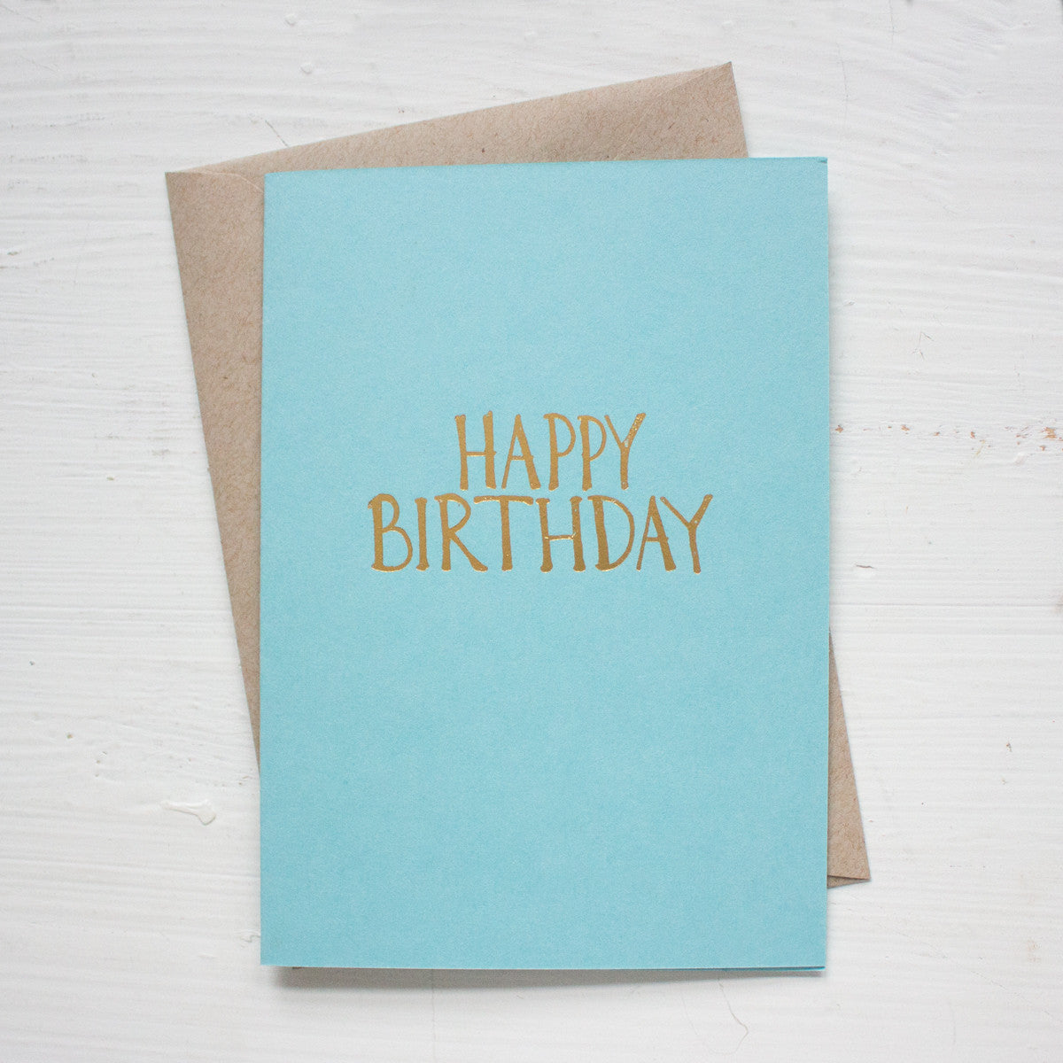 folded note cards with handwritten HAPPY BIRTHDAY hand hot foil stamped in white or gold. this type of printing leaves a slight impression where the die meets the paper.