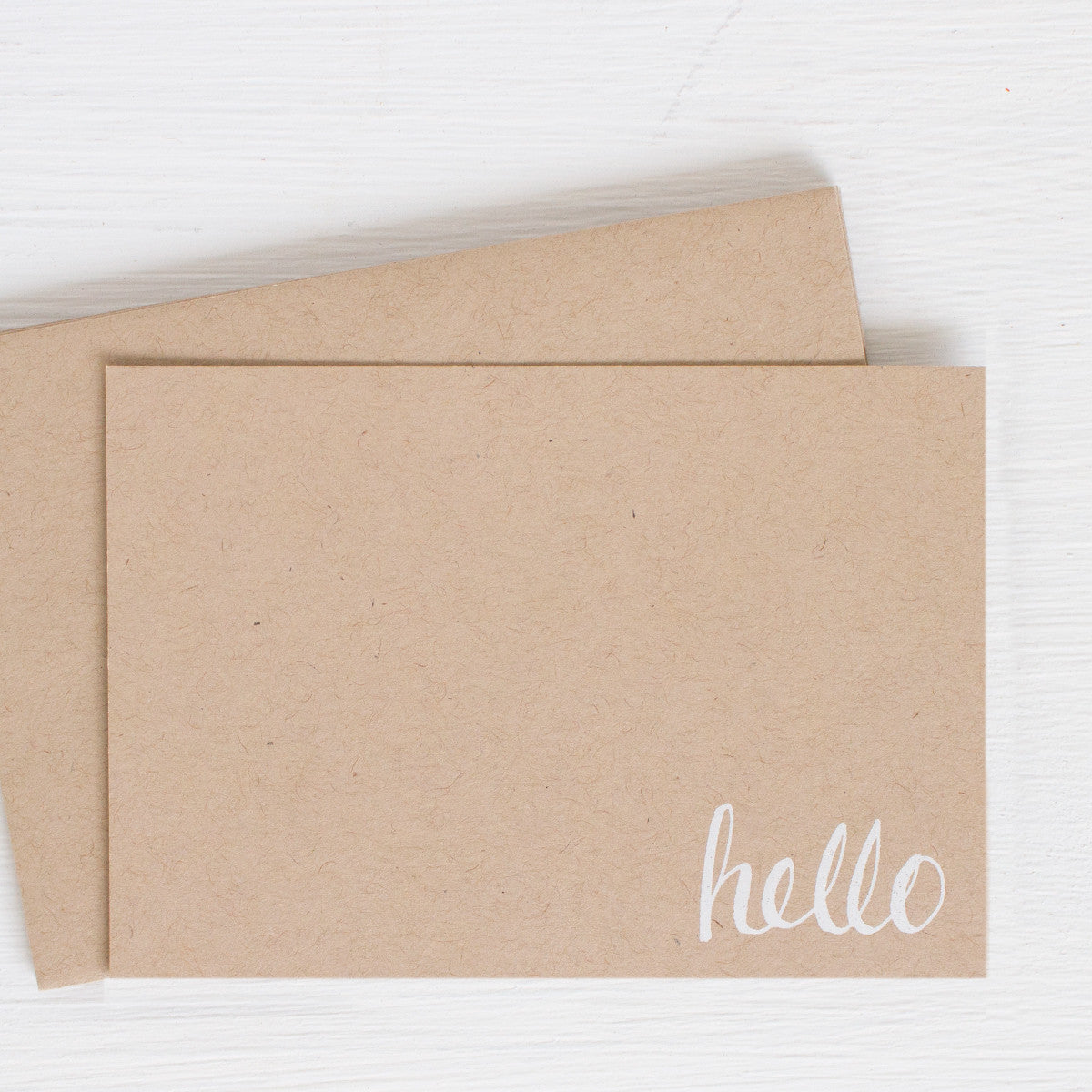 simple set of flat notecards with handwritten HELLO hot foil stamped in white.