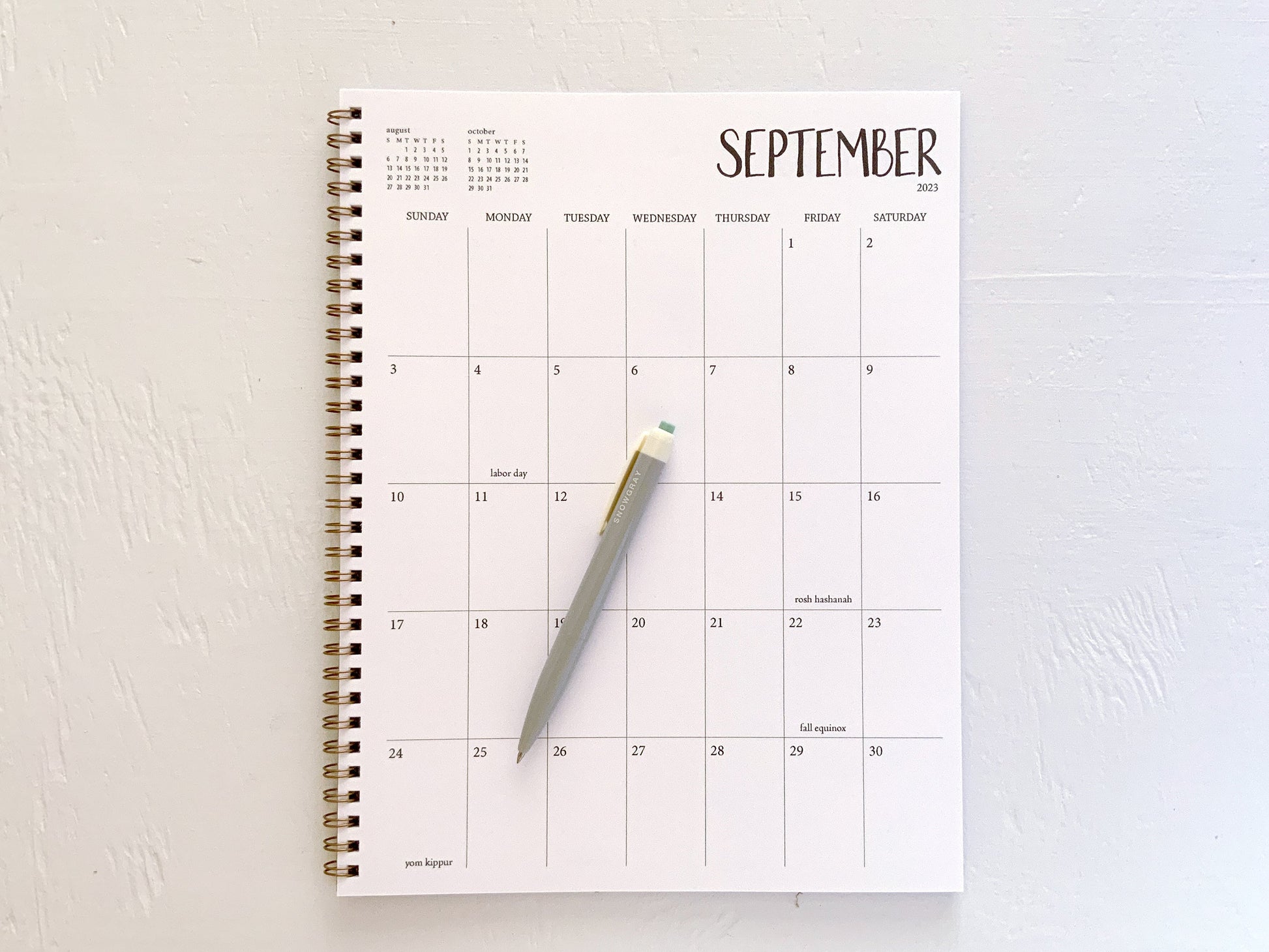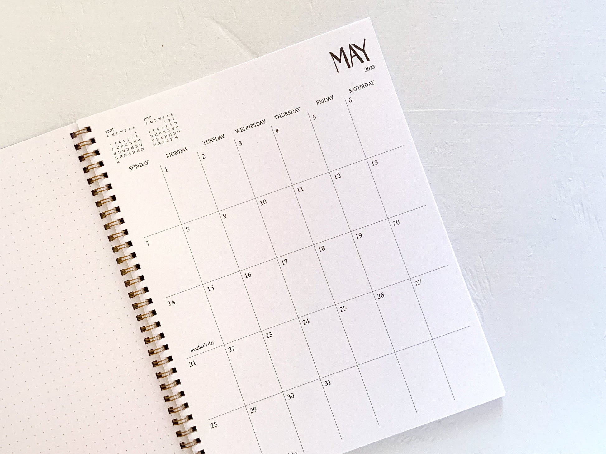 this spiral bound planner has the month on the right side with room to mark events, appointments and other timely details. left pages are dot grid for all of your monthly planning - - - keeping track of income & expenses, recording goals, planning projects, making lists or organizing projects.