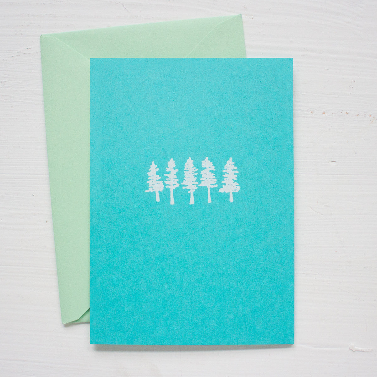folded note cards with a tiny forest of evergreen trees hand hot foil stamped in white or gold. this type of printing leaves a slight impression where the die meets the paper.