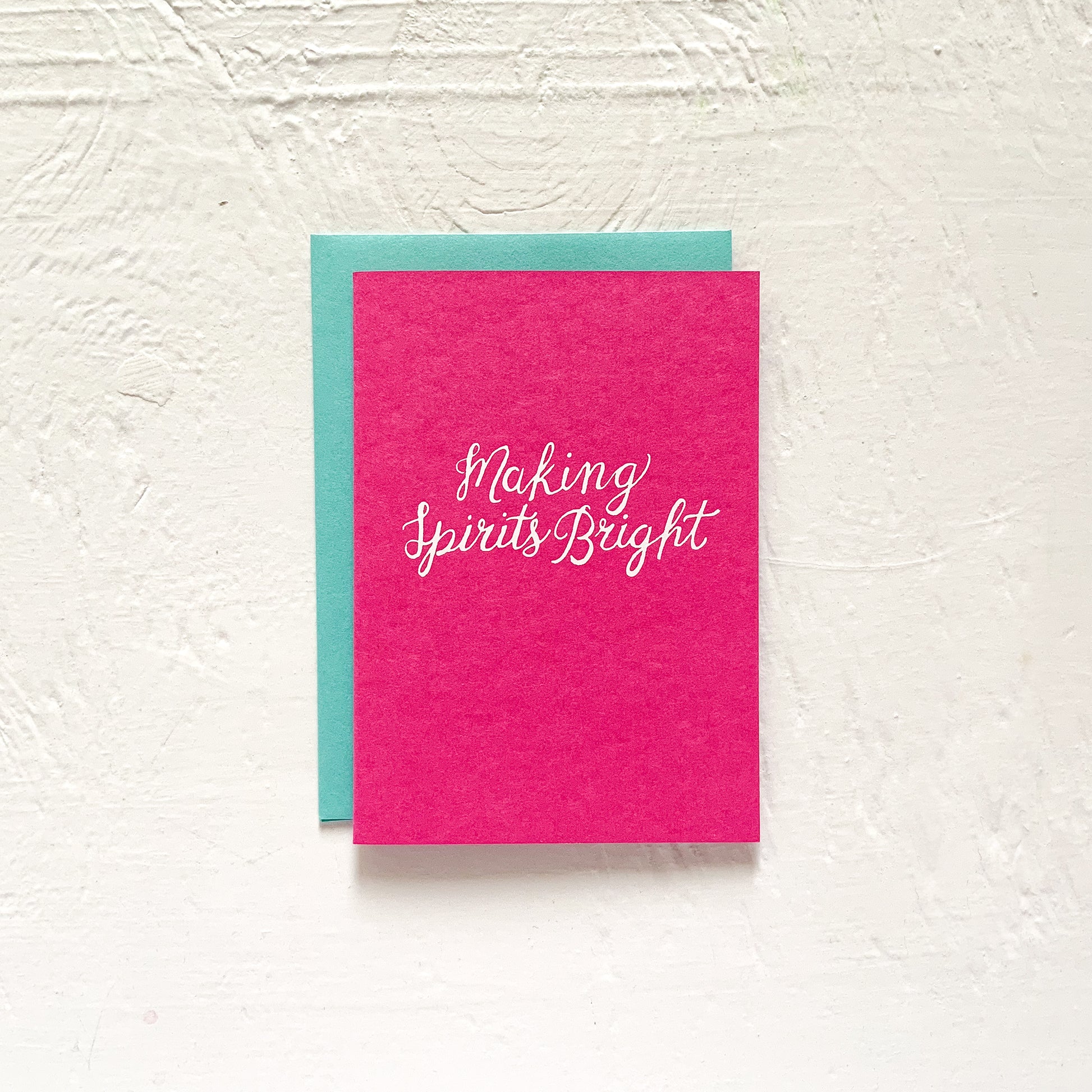 simple folded note cards with handwritten MAKING SPIRITS BRIGHT hand hot foil stamped in white or gold. this type of printing leaves a slight impression where the die meets the paper.