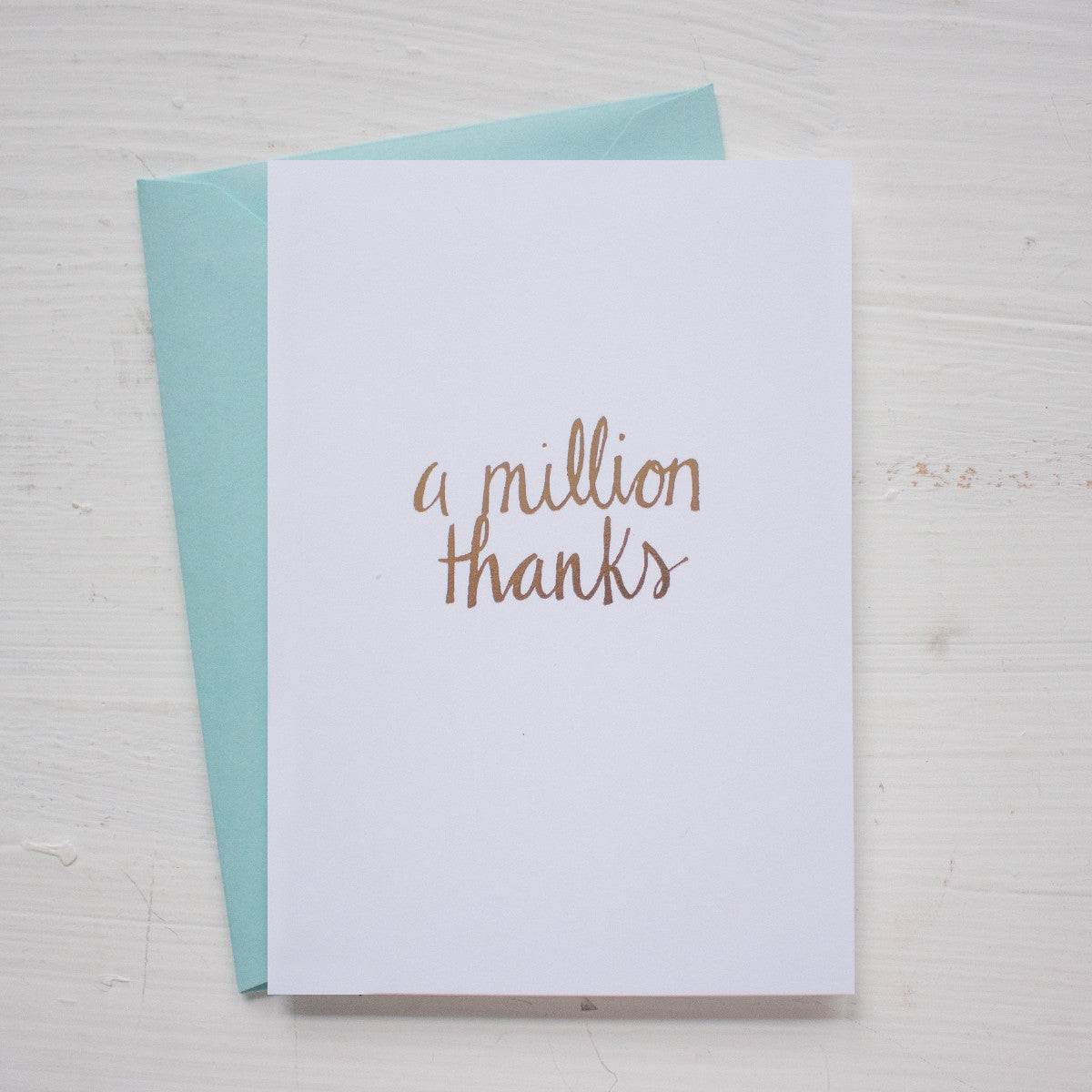 folded note cards with handwritten "a million thanks" hand hot foil stamped in white or gold. this type of printing leaves a slight impression where the die meets the paper.