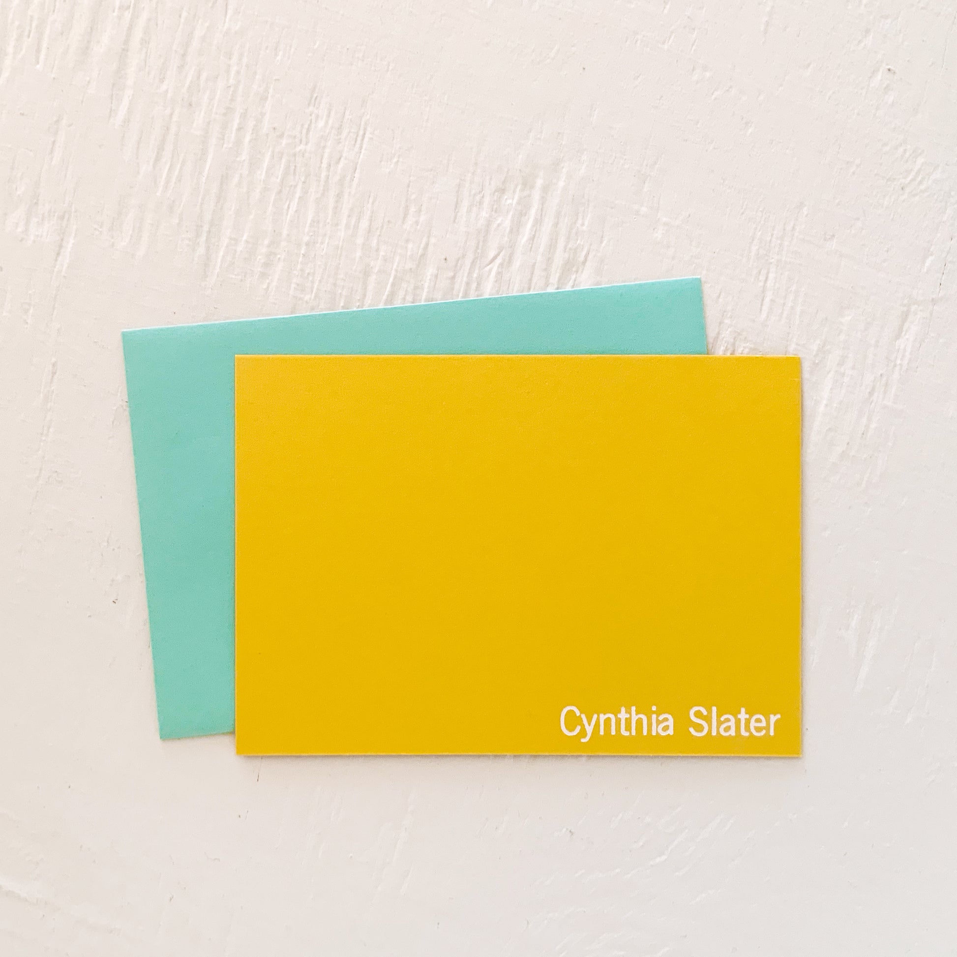 simple foil stamped flat cards. the name is foil stamped in gold or white foil with a choice of card and envelope color.