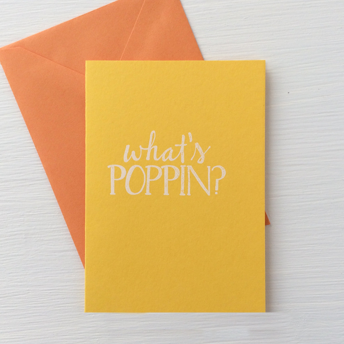 folded note cards with handwritten "what's poppin" hand hot foil stamped in white or gold. this type of printing leaves a slight impression where the die meets the paper.