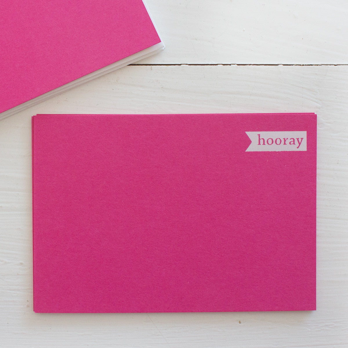 simple set of dark pink flat notecards with hooray in a banner hot foil stamped on them. these cards are great for sending for thank yous, encouragement and celebration.