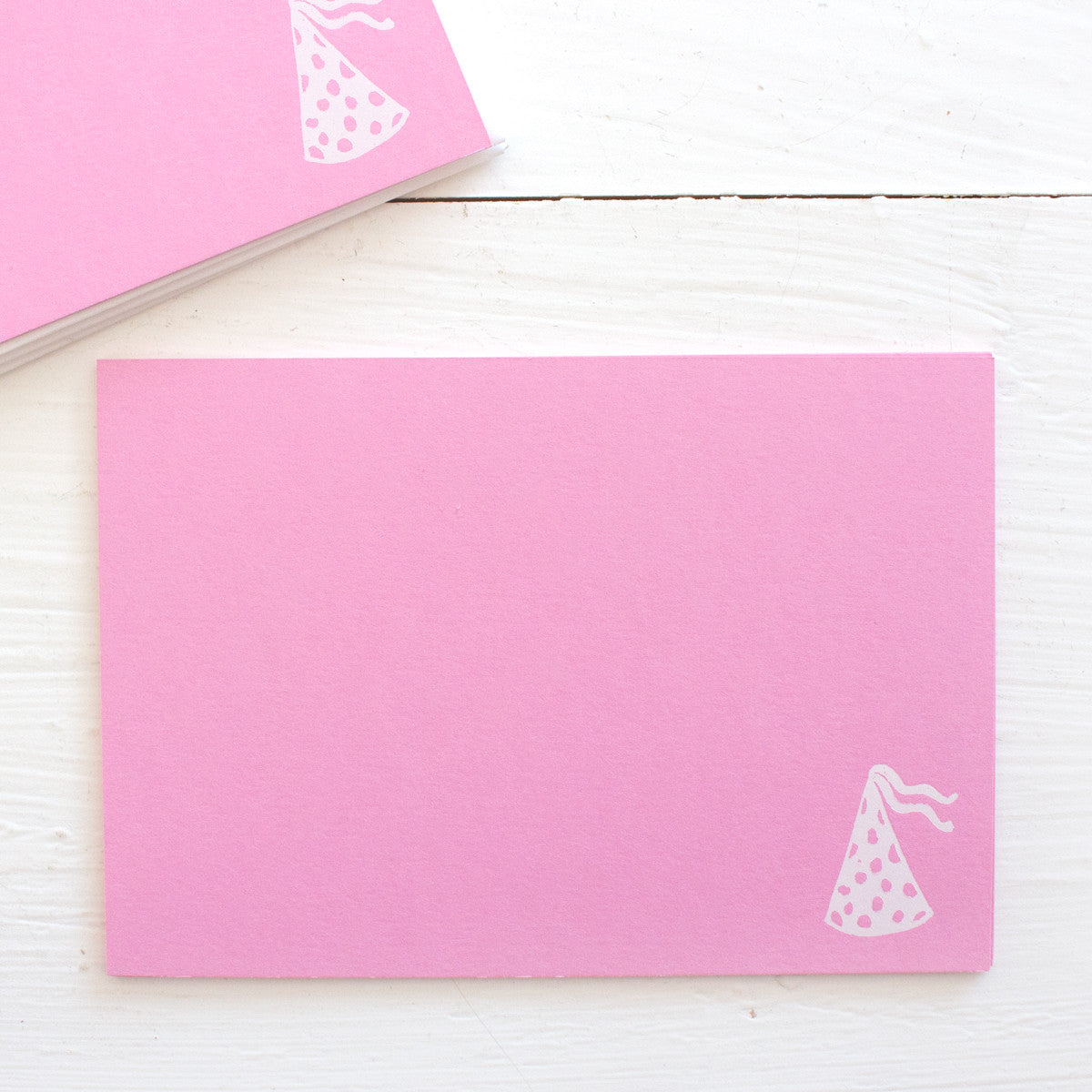 simple set of pink flat notecards with a PARTY HAT hot foil stamped on them.