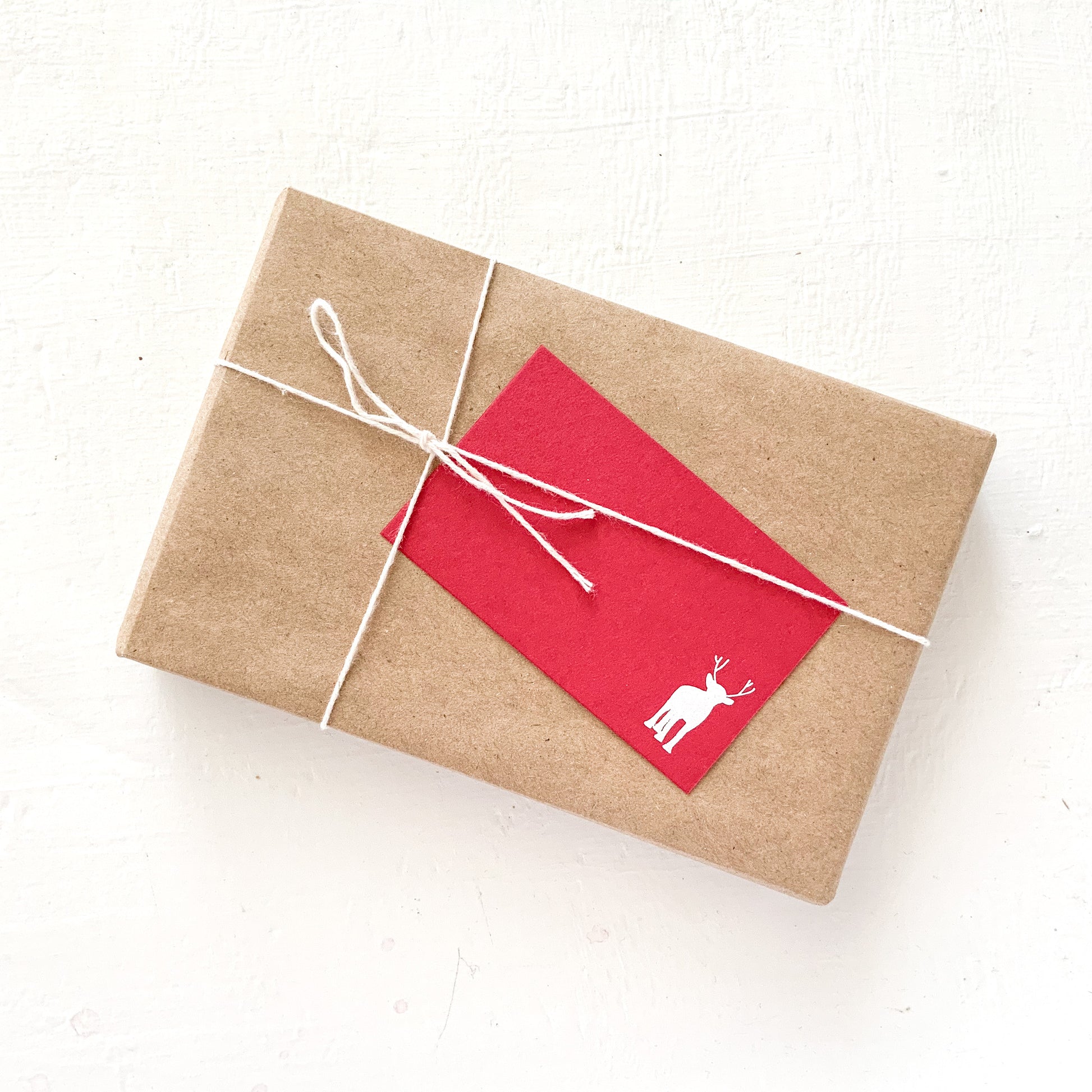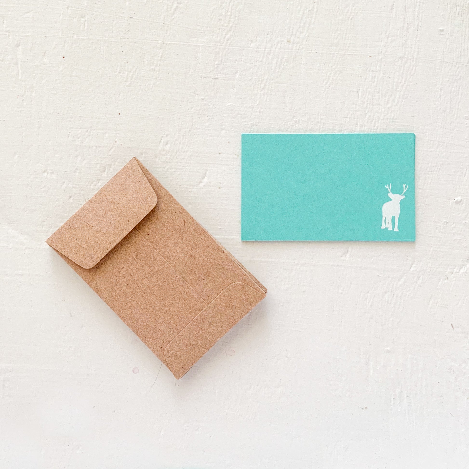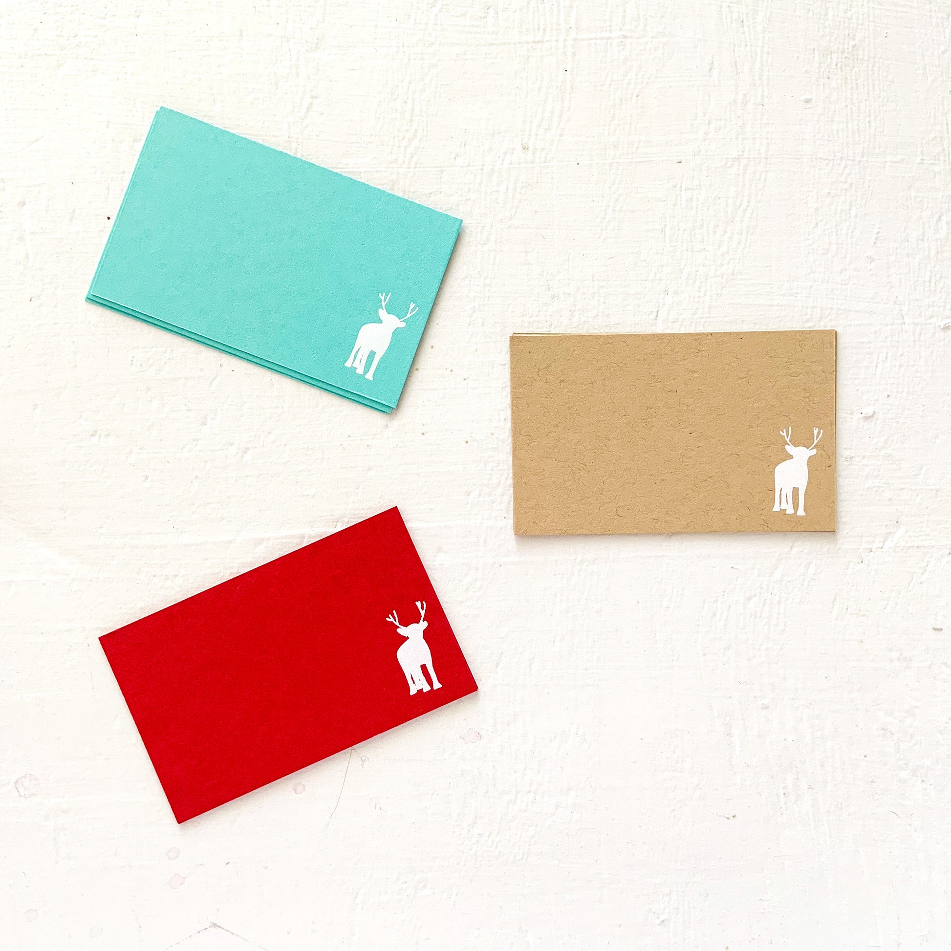 gift enclosures with a reindeer hand foil stamped in white or gold. add these miniature cards to gifts or use as tiny notes. they also work great for entertaining as place cards or buffet markers.