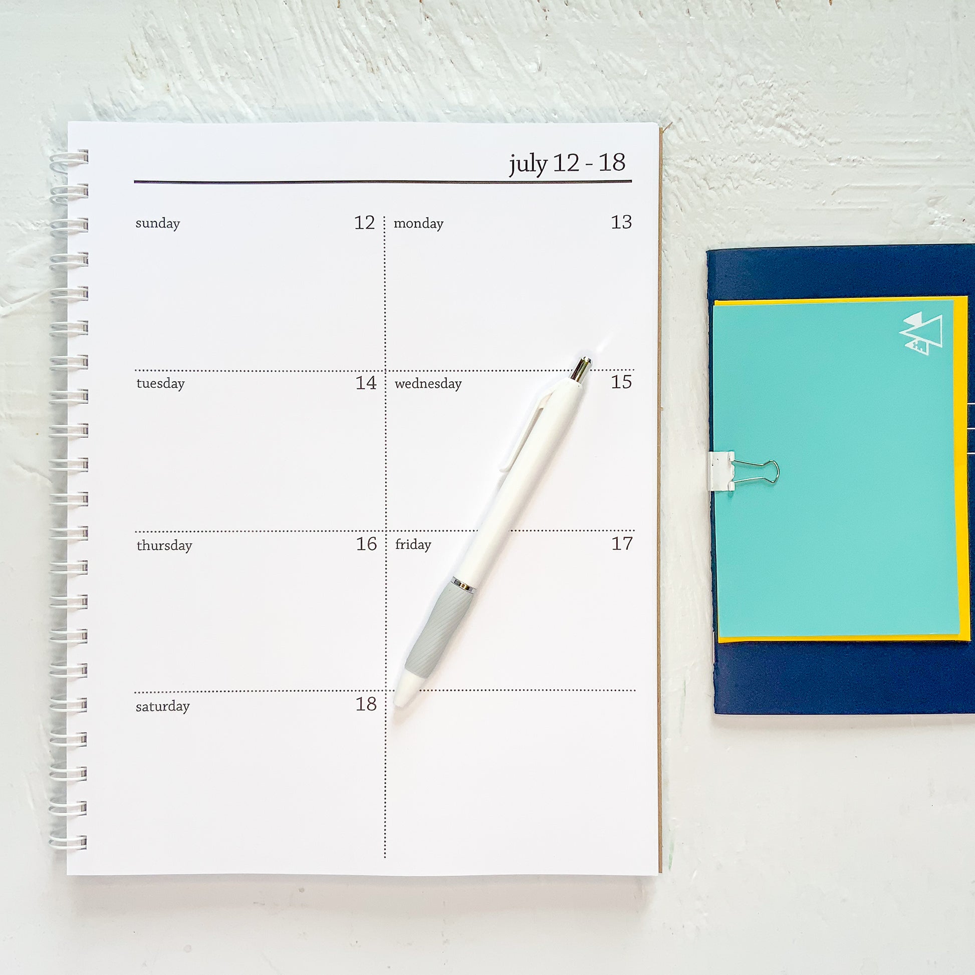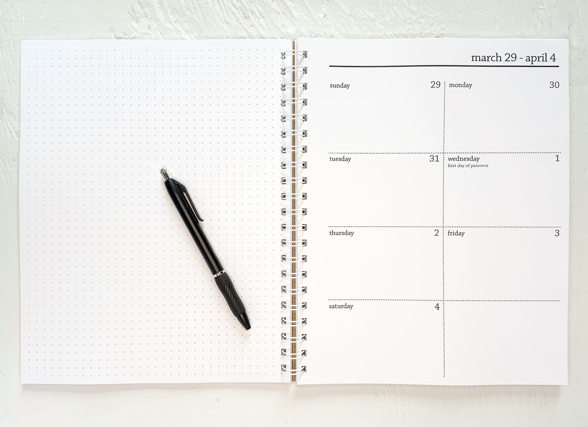 simple weekly planner with a week per page. the week is on the right side of the planner with a block for each day. the blocks give you room to write events and appointments. on the left of each week there is a dot grid page - perfect for weekly notes, lists, goals - whatever you need to record for the week.