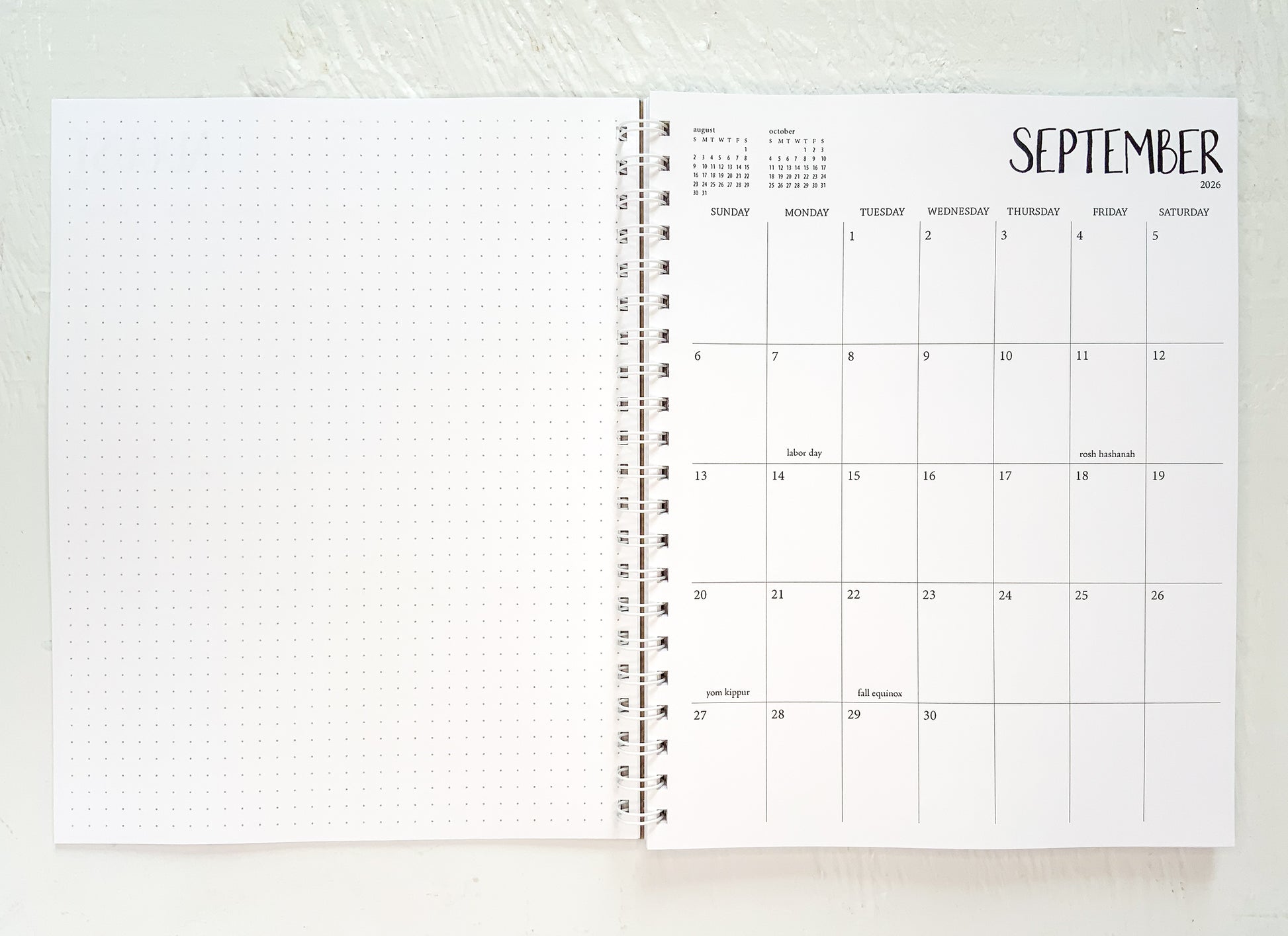 the front of the planner has 1 page monthly spreads. the back of the planner has 4 dot grid sheets for notes you want to keep all year or planning ahead.