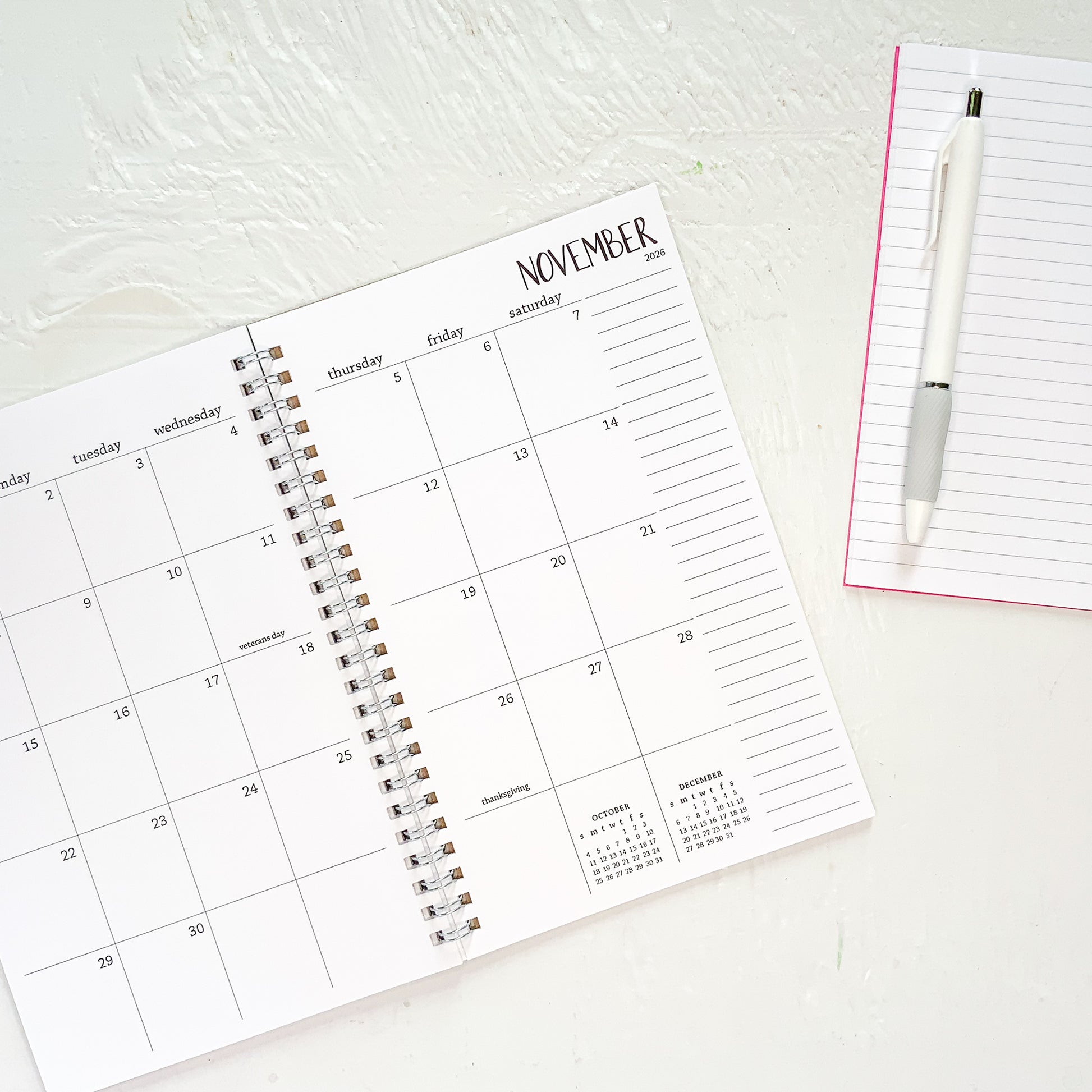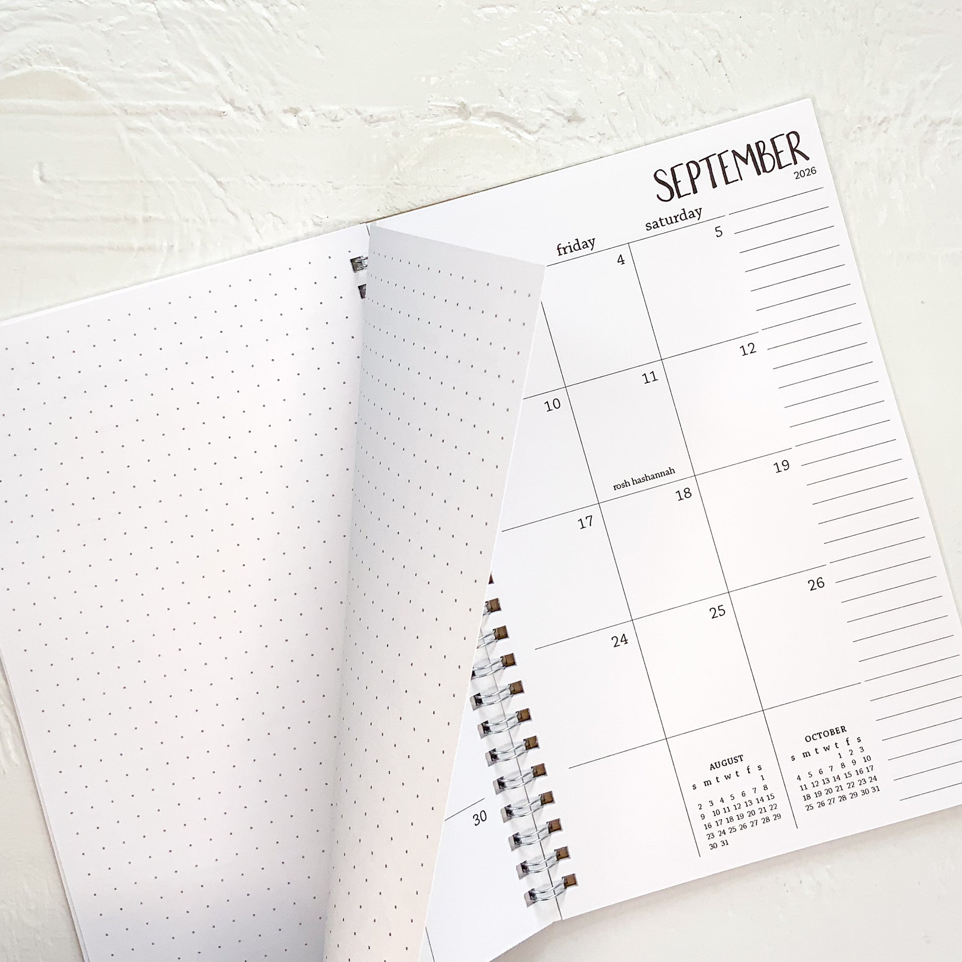 this spiral bound planner has the months on 2 pages with plenty of room to mark events, appointments and other timely details. 2 dot grid pages between each month.