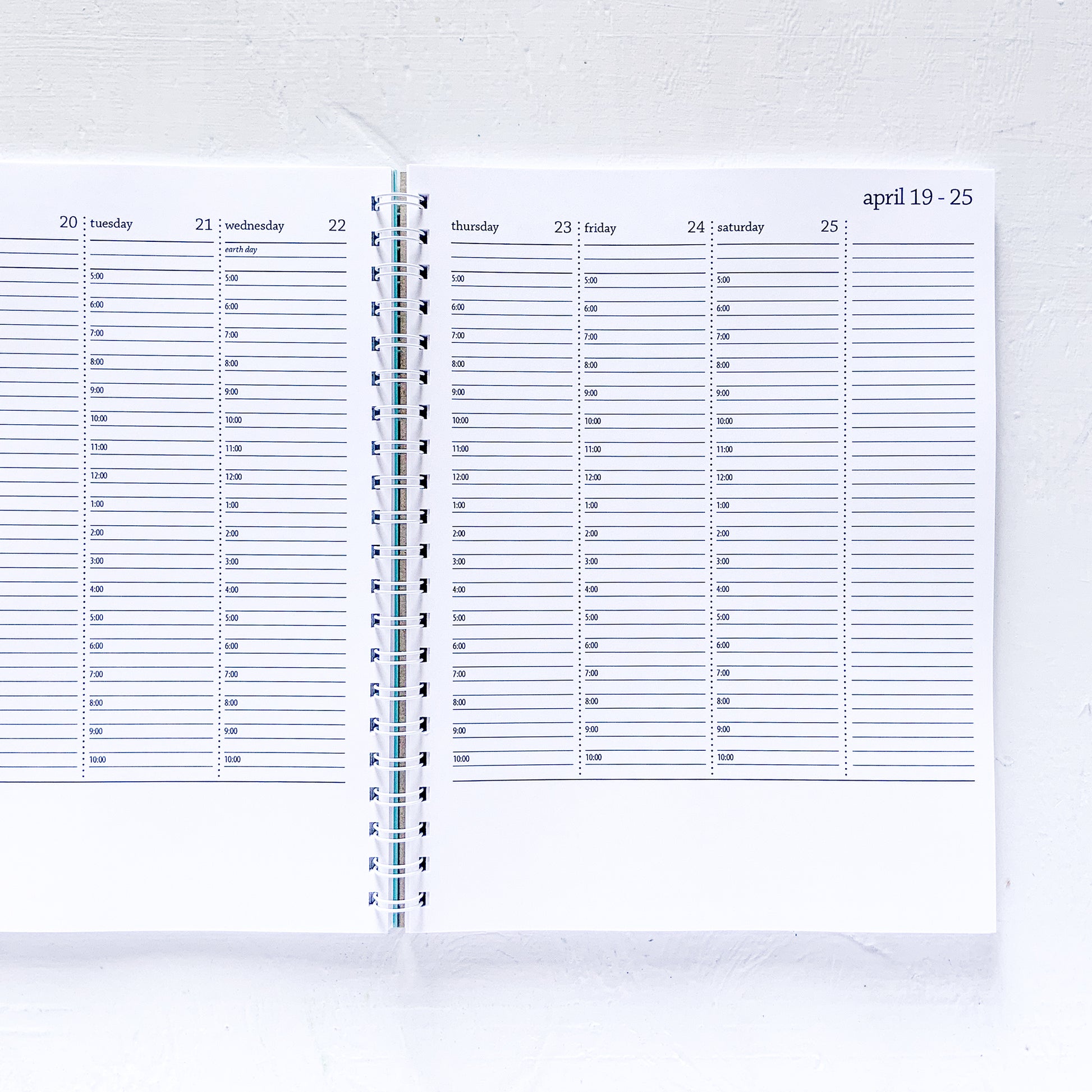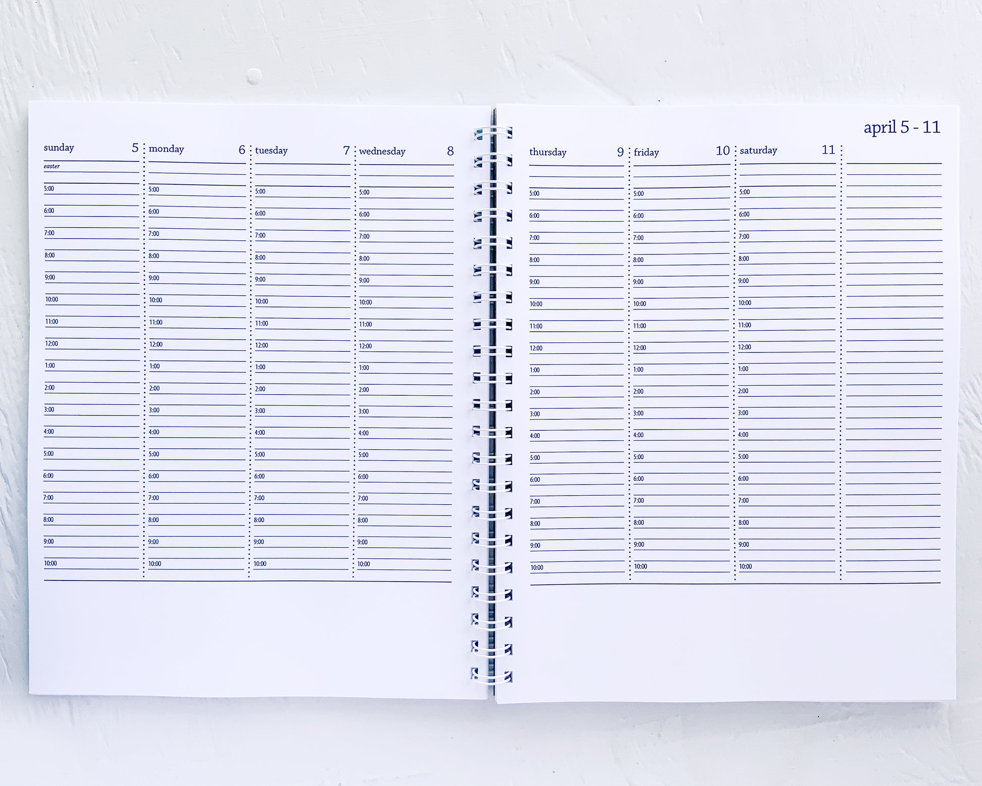 planner has 2 pages per week. each day has a timed vertical layout that goes from 5 am to 10 pm. top of each column has a place to note all day events/focuses. there is space on the right of the layout for weekly lists and reminders. bottom of weekly pages is blank for notes, sketches, etc ...