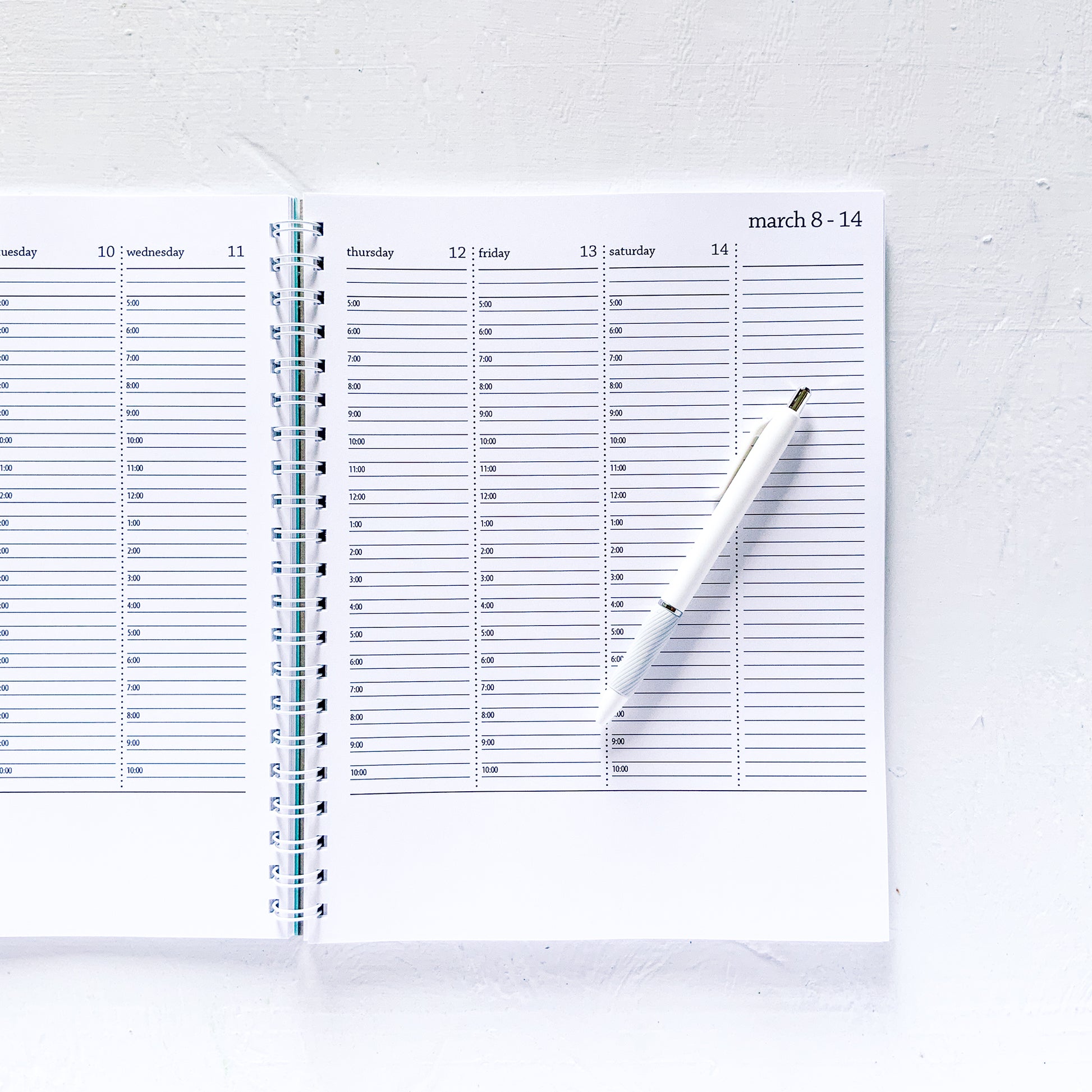 2026 large weekly spiral planner with a timed vertical layout.