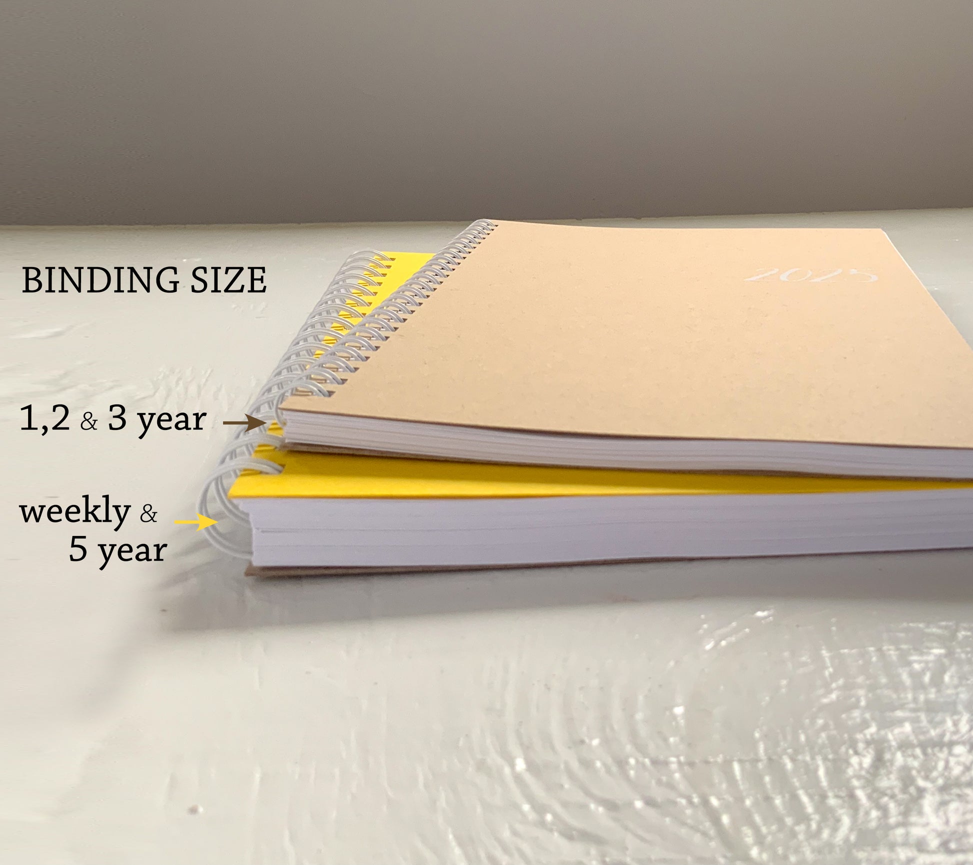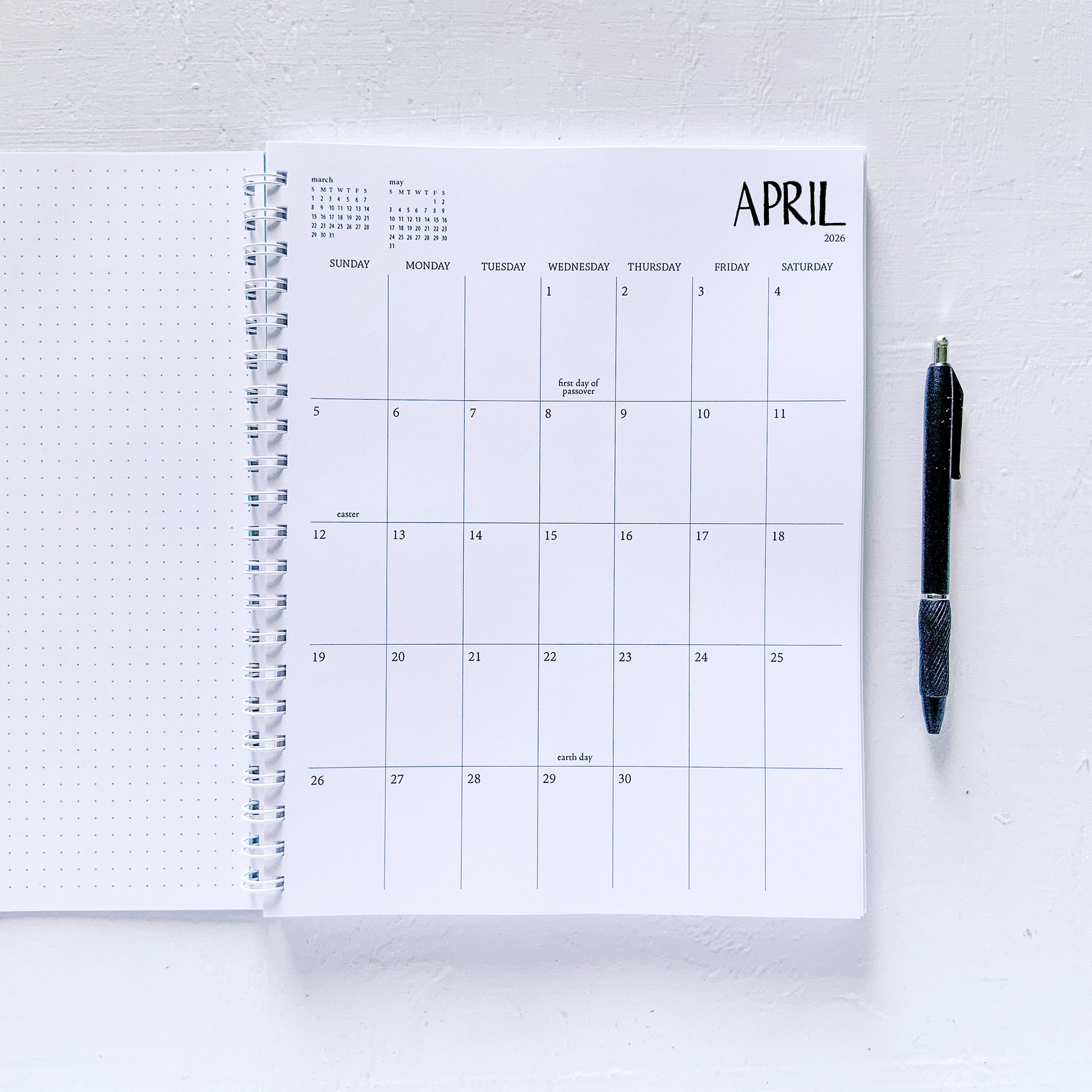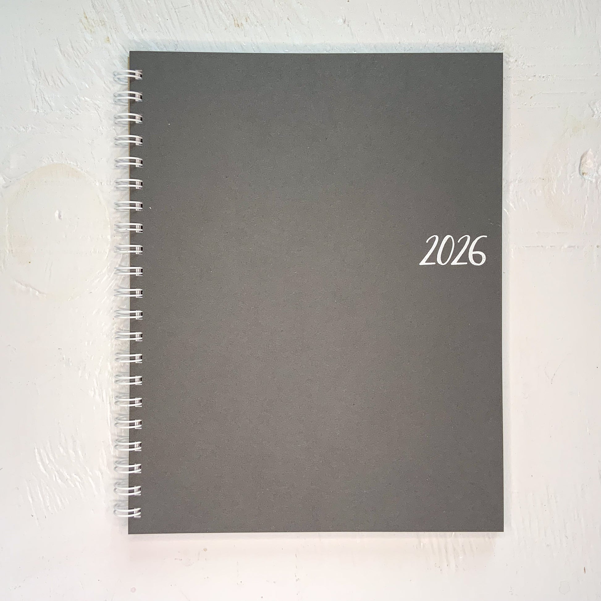 planner is bound with spiral binding. cover is cement with "2026" hot hand foil stamped in white.