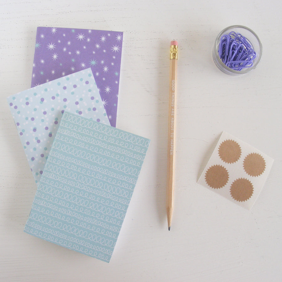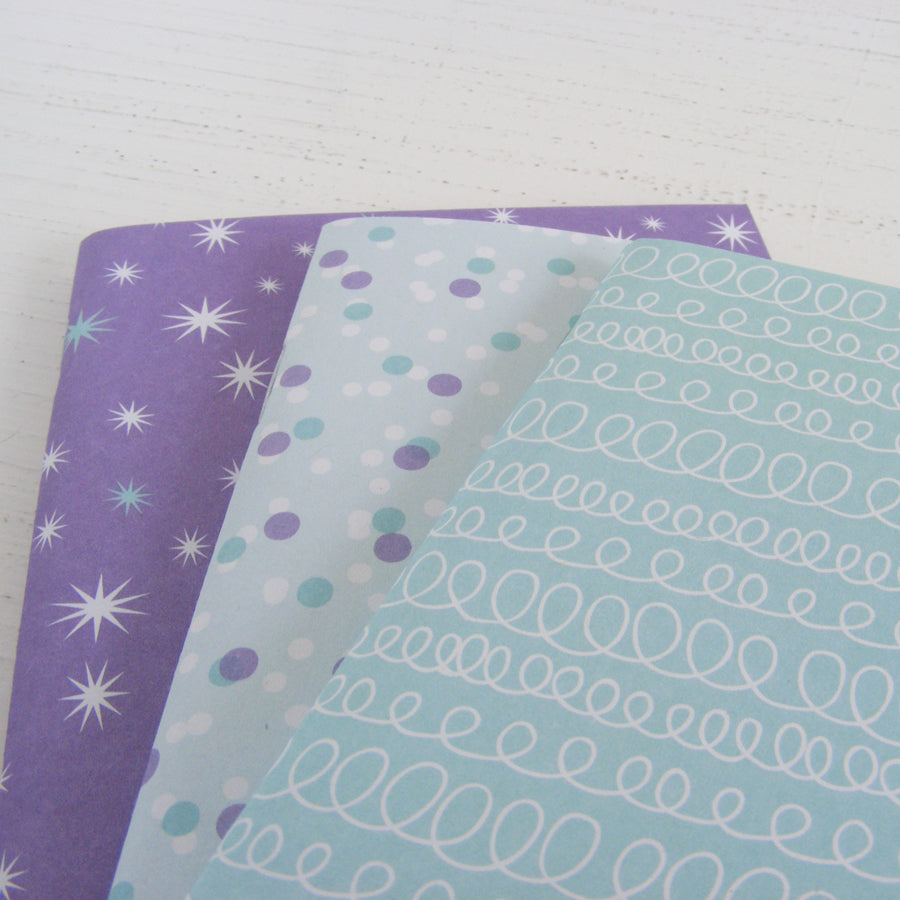 set of 3 mini booklets in festive teal and purple patterns. each of these little journals are filled with 40 blank pages - perfect for on-the-go lists, inspiration, appointments and notes. just the right size to take with you anywhere you go.