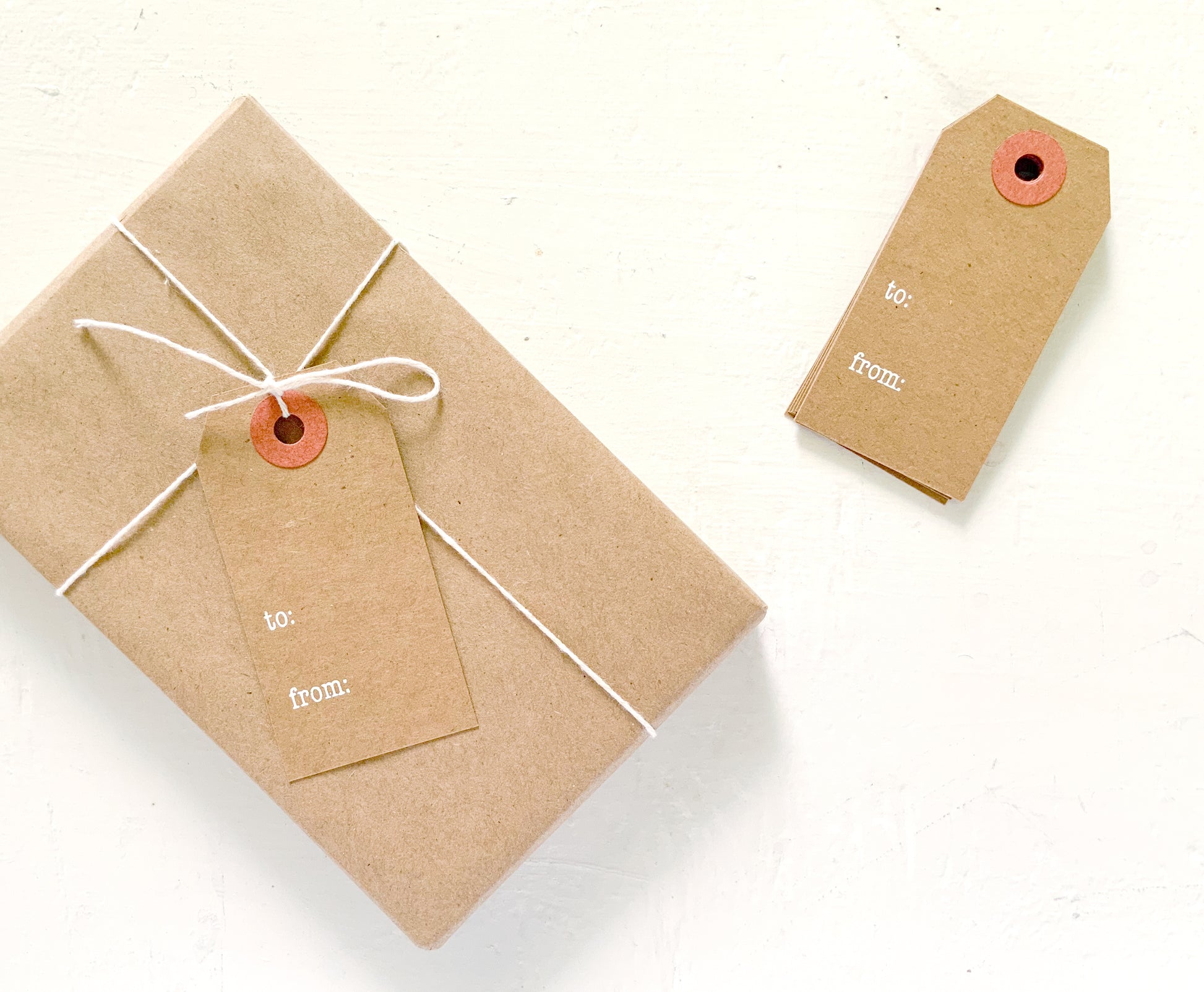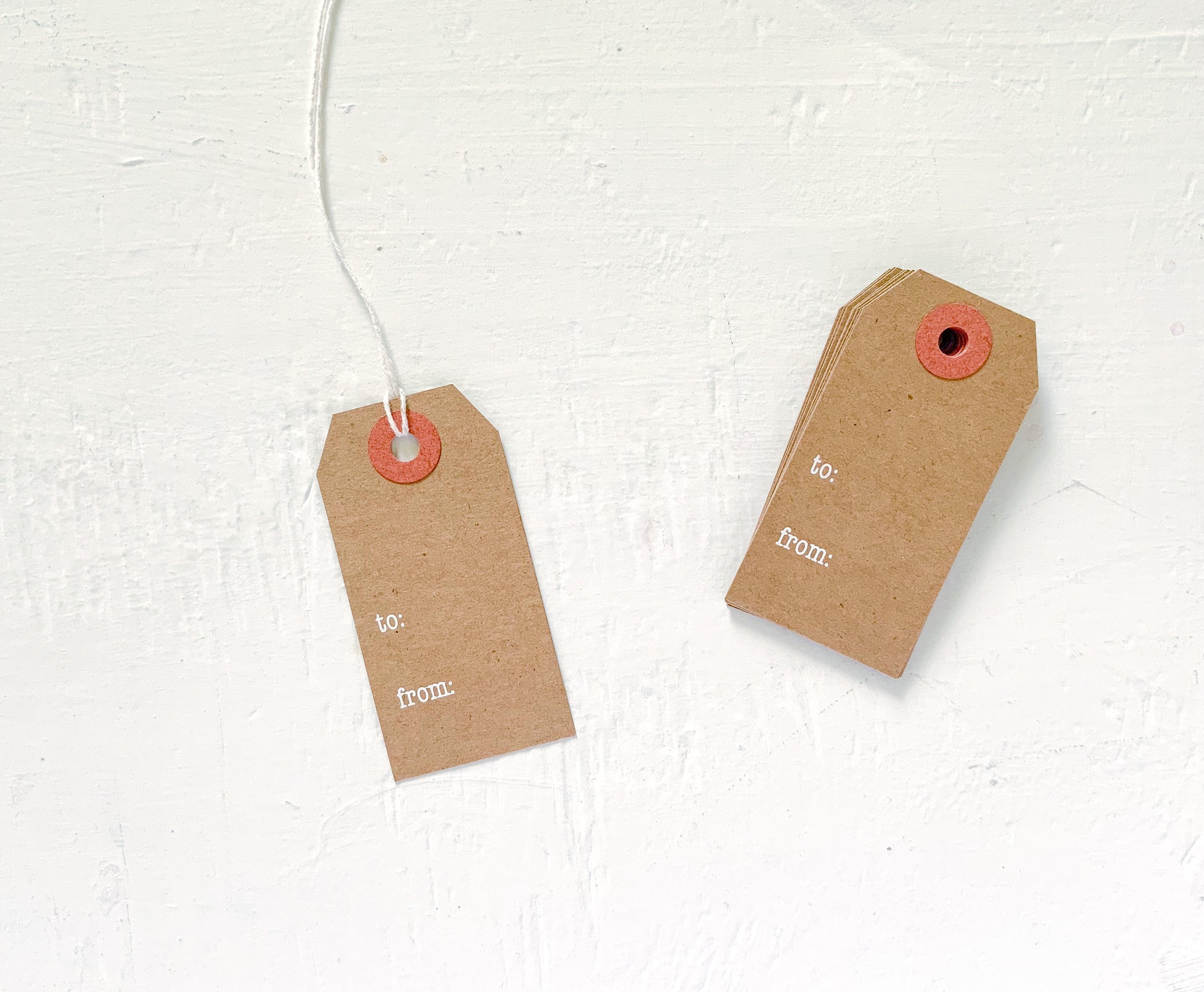 to / from is hand foil stamped in white on recycled kraft gift tags. Great for bottles of wine, gift bags or wrapped around a gift.